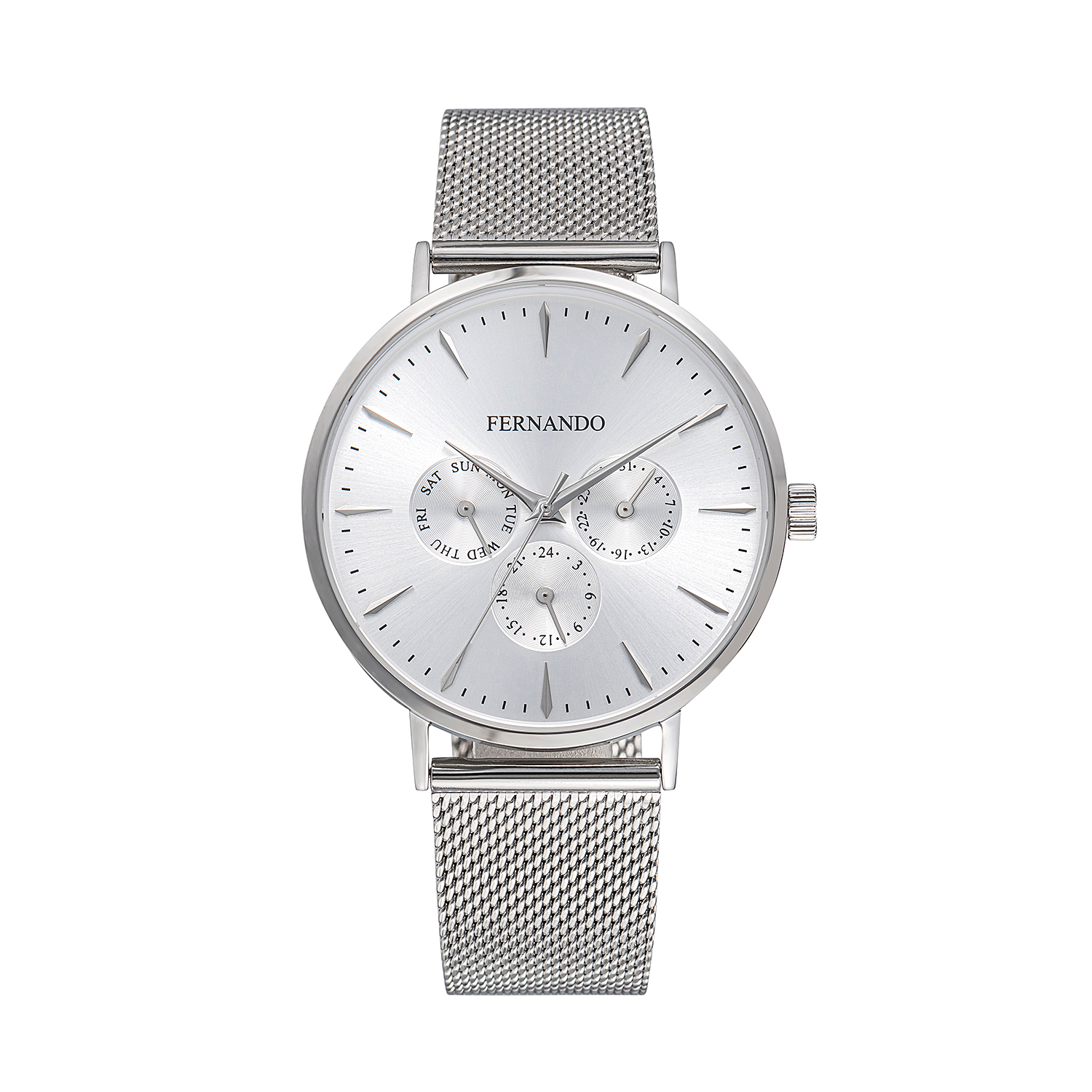 שעון יד אלגנטי עם לוח כסוף, מחוגים ואינדקסים כסופים וגוף שעון תואם, רצועת רשת כסופה חותמת את המראה בקו נקי, מודרני ואלגנטי.