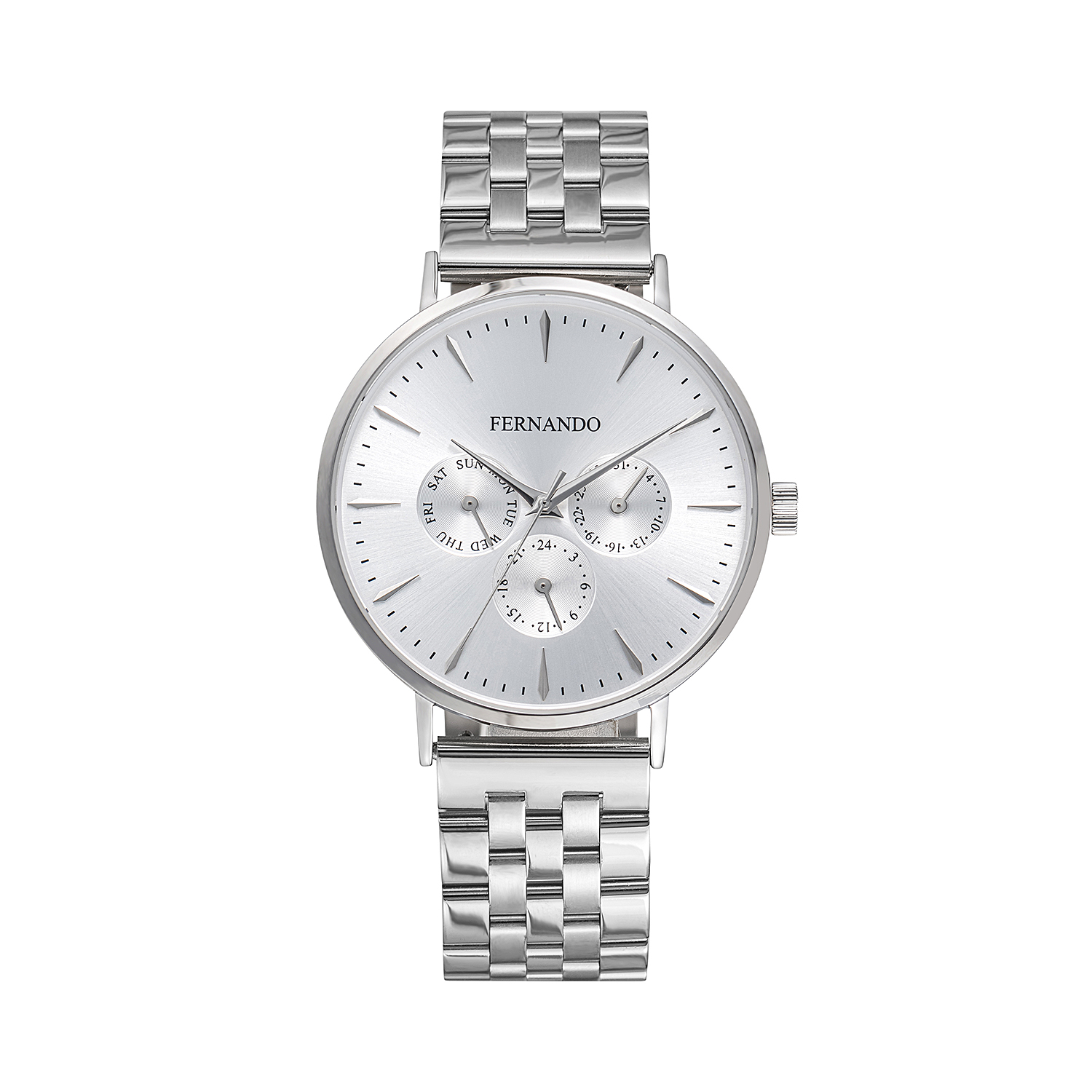 שעון יד אלגנטי עם לוח כסוף, מחוגים ואינדקסים כסופים וגוף שעון תואם, רצועת מתכת כסופה מעניקה נוכחות אלגנטית ותחושת איכות על היד.