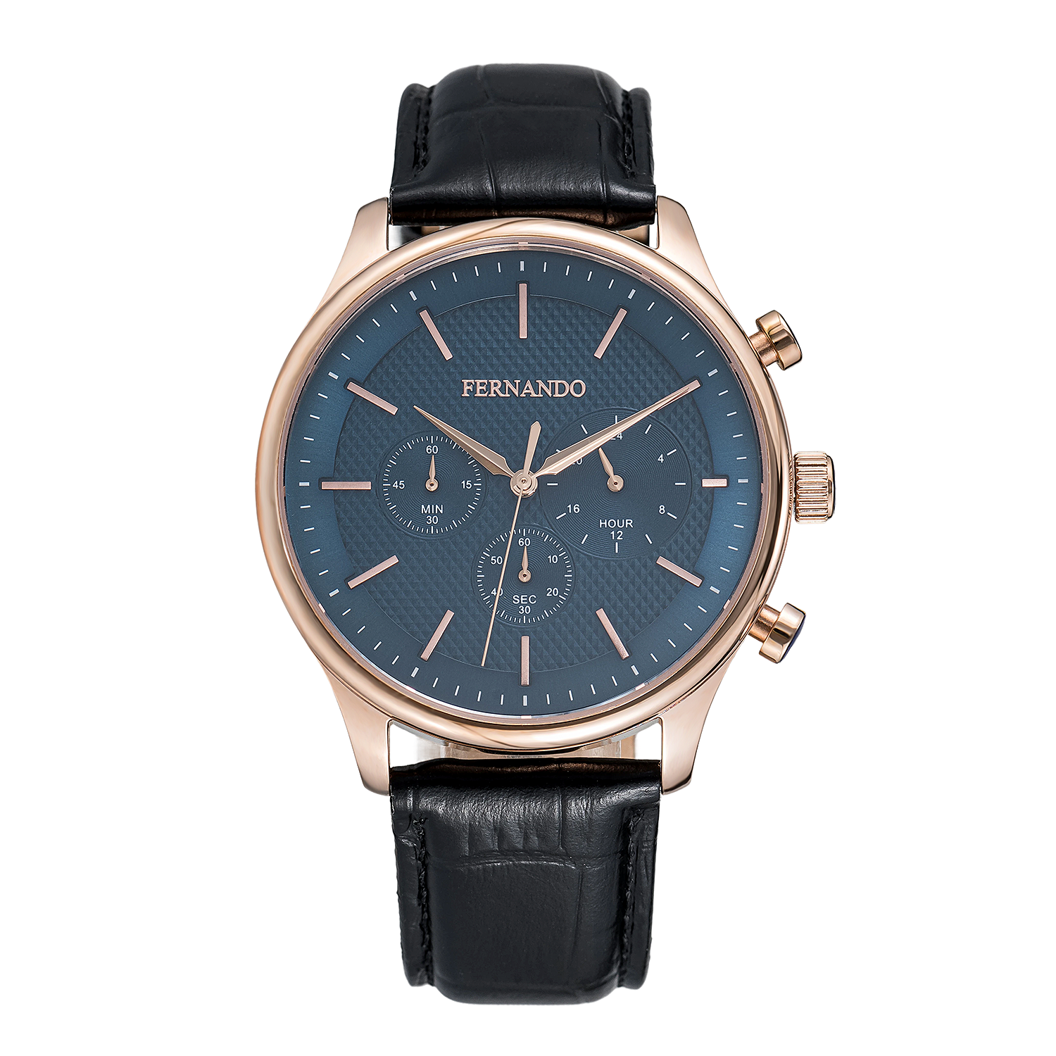 שעון עם לוח טקסטורה בגוון כחול, מחוגים ואינדקסים בגימור רוז גולד וגוף שעון תואם, רצועת עור שחורה משלימה חיבור מאוזן בין נוחות לאיכות.