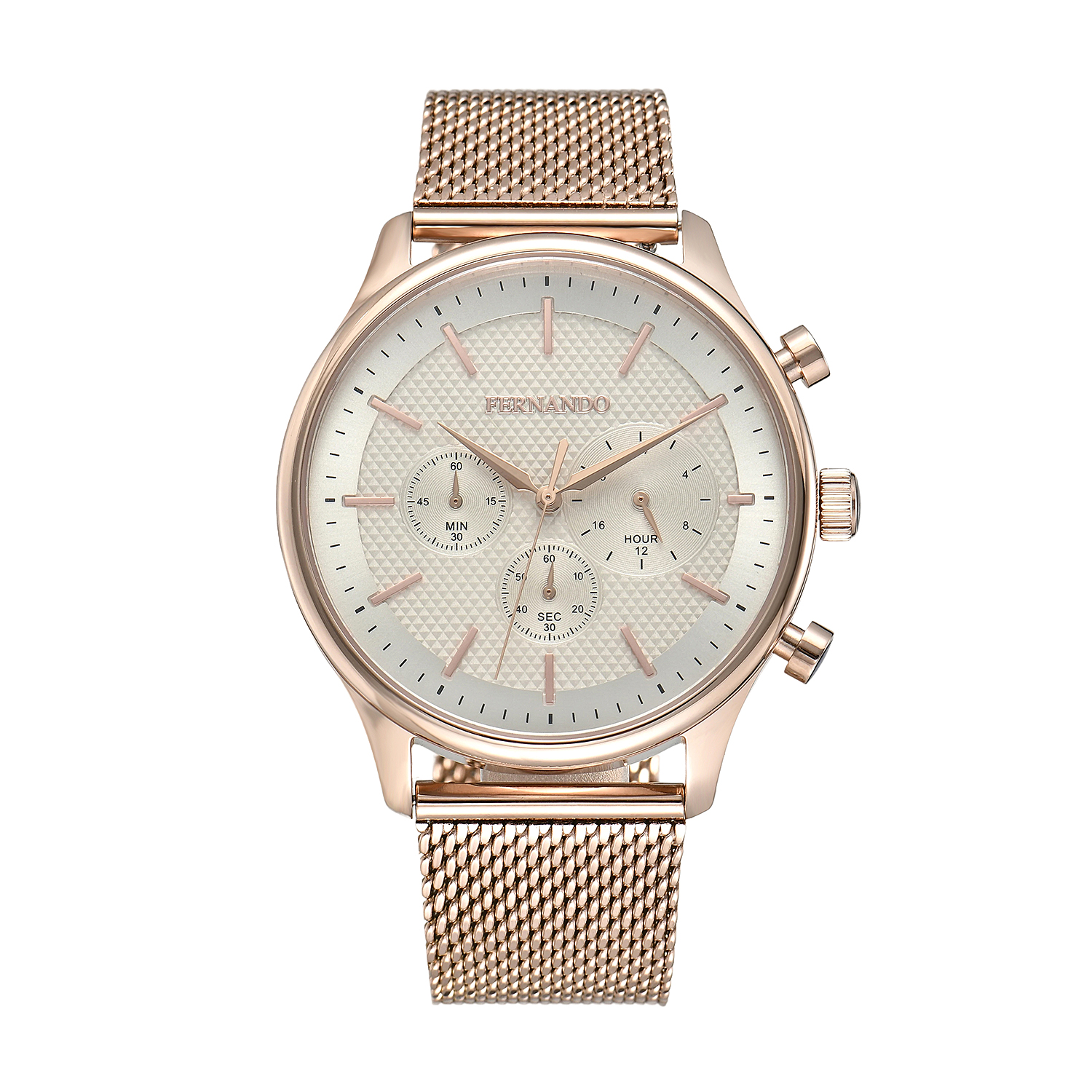 שעון עם לוח טקסטורה בגוון שמנת, מחוגים ואינדקסים בגימור רוז גולד וגוף שעון תואם, רצועת רשת בגוון רוז גולד ליצירת מראה נקי ויוקרתי.