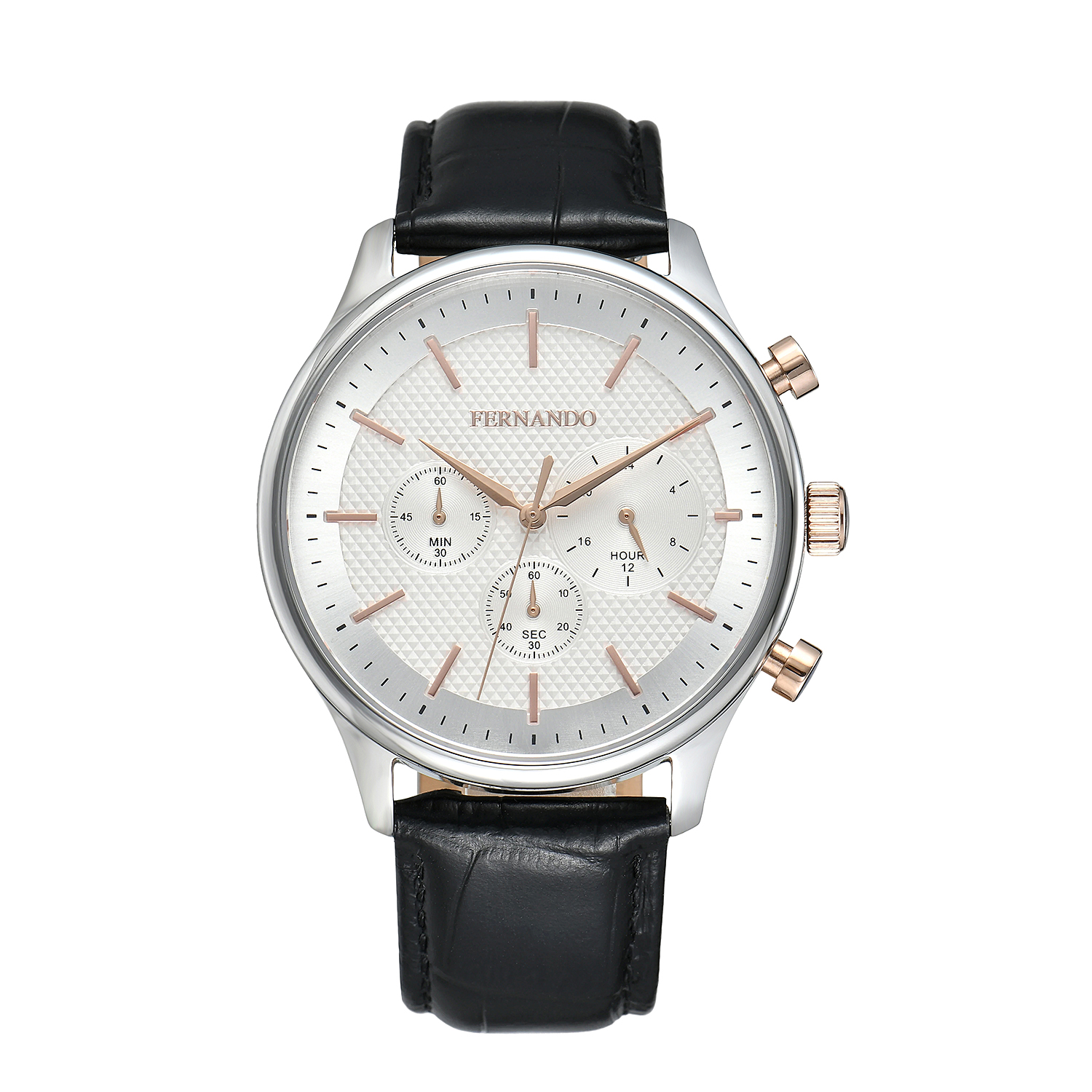 שעון עם לוח טקסטורה בגוון לבן, מחוגים ואינדקסים בגימור רוז גולד, גוף שעון כסוף, רצועת עור שחורה משלימה חיבור מאוזן בין נוחות לאיכות.