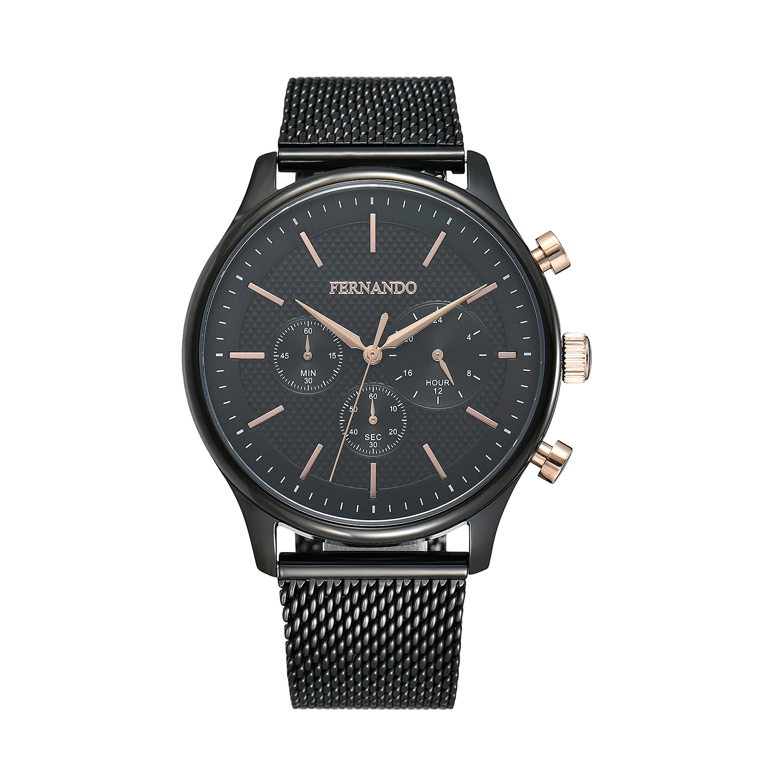שעון עם לוח טקסטורה בגוון שחור, מחוגים, אינדקסים, כתר וכפתורי כרונוגרף בגימור רוז גולד, גוף שעון כסוף, רצועת רשת כסופה ליצירת מראה נקי ויוקרתי.