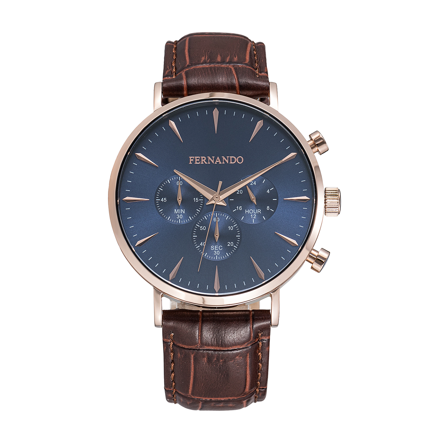 שעון יד בעיצוב קלאסי ואלגנטי עם לוח כחול, מחוגים ואינדקסים בגימור רוז גולד וגוף שעון תואם. רצועת עור חומה משלימה מראה יוקרתי ומוקפד,