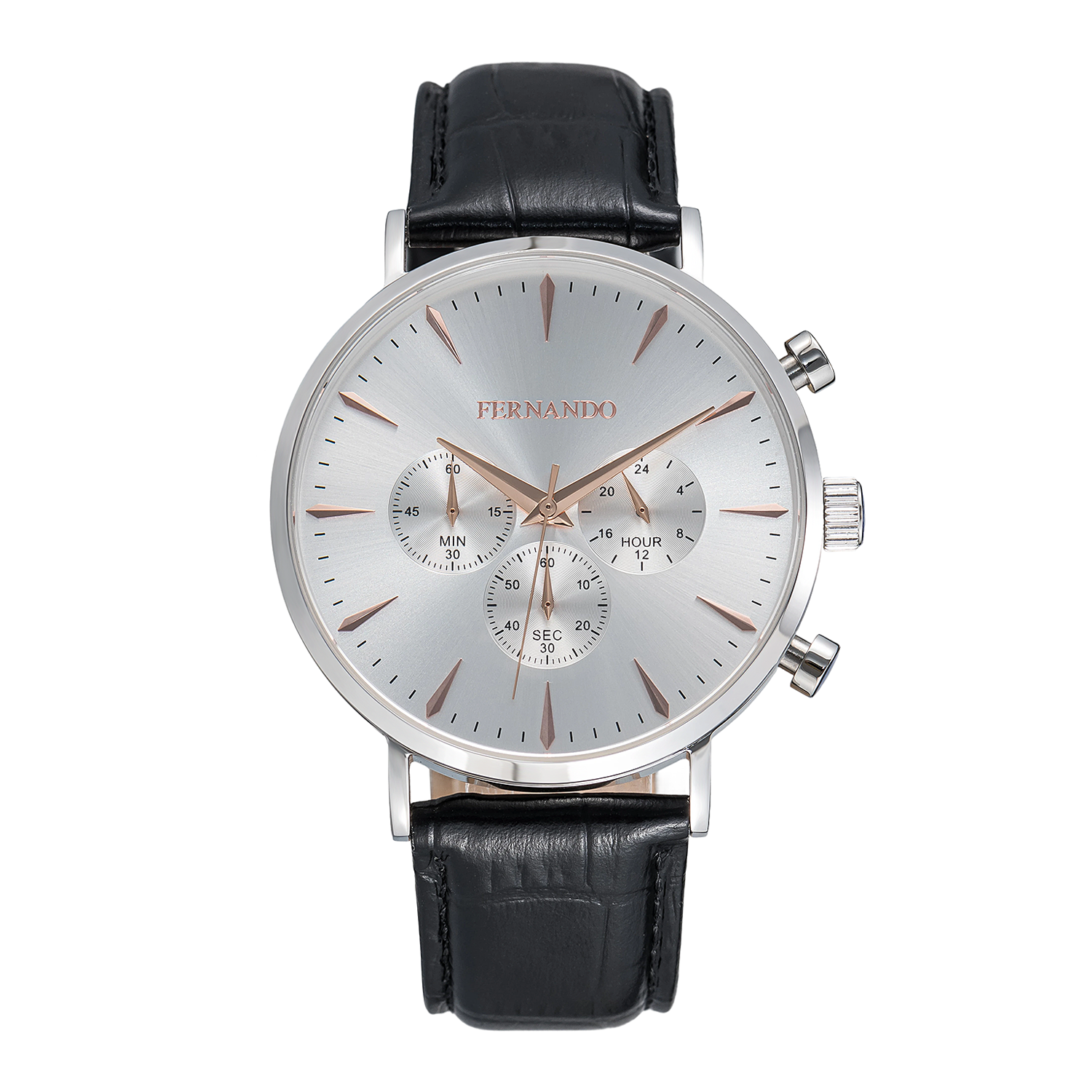 שעון יד בעיצוב קלאסי ואלגנטי עם לוח כסוף, מחוגים ואינדקסים בגימור רוז גולד, גוף שעון כסוף. רצועת עור שחורה משלימה מראה יוקרתי ומוקפד,