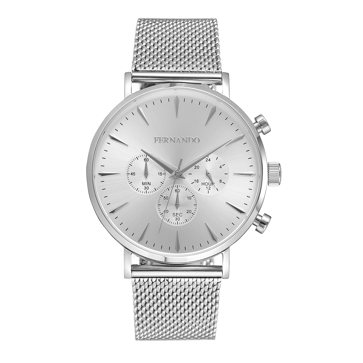 שעון יד בעיצוב קלאסי ואלגנטי עם לוח כסוף, מחוגים ואינדקסים כסופים, גוף שעון כסוף, רצועת רשת כסופה חותמת את המראה בקו נקי ויוקרתי.