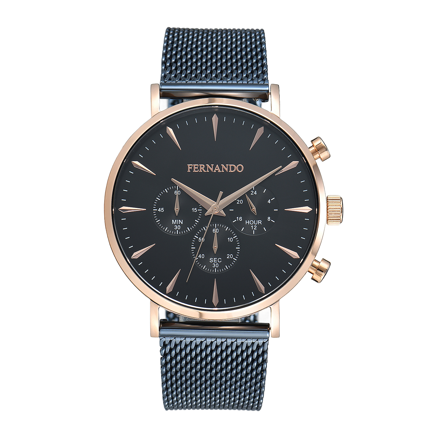 שעון יד בעיצוב קלאסי ואלגנטי עם לוח שחור, מחוגים ואינדקסים בגימור רוז גולד וגוף שעון תואם, רצועת רשת כחולה חותמת את המראה בקו נקי ויוקרתי.