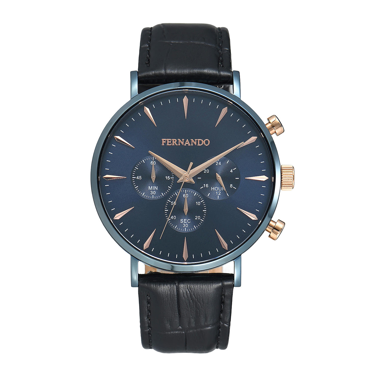 שעון יד בעיצוב קלאסי ואלגנטי עם לוח כחול, מחוגים, אינדקסים, כתר וכפתורי כרונוגרף בגימור רוז גולד, גוף שעון כחול. רצועת עור שחורה משלימה מראה יוקרתי ומוקפד,